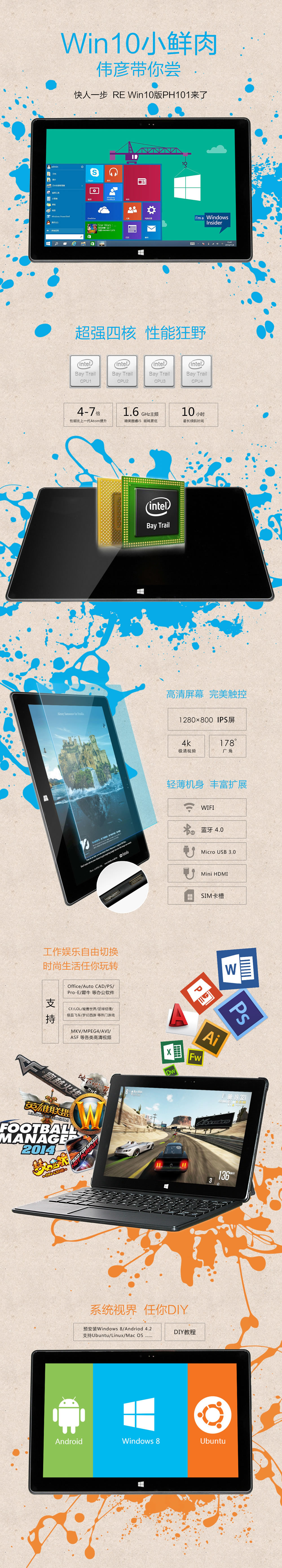 提供标配:PH-101平板主机,充电器,保修卡,说明书。赠送键盘与皮套。